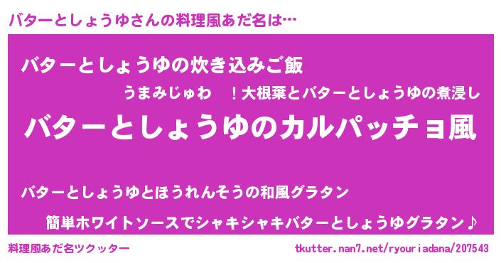 | 女子向けラノベタイトル風あだ名 | 『バターとしょうゆが死なない童話 林檎のバターとしょうゆの診療簿』 |