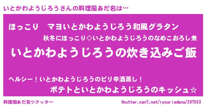 | 胡散臭い通販商品みたいなあだ名 | 『あなたにだけ特別に提供する限定10本のレアな日本酒…その名も「いとかわようじろう」』 |