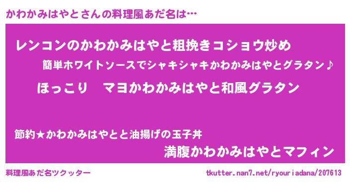 | ヘコむあだ名 | 『かわかみはやと(震え声)』『かわお』 |