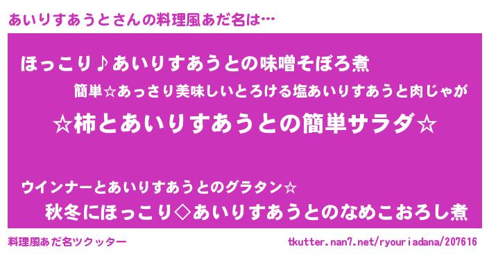 | 胡散臭い通販商品みたいなあだ名 | 『モテモテ間違いなし水晶球…その名も「あいりすあうと」』 |