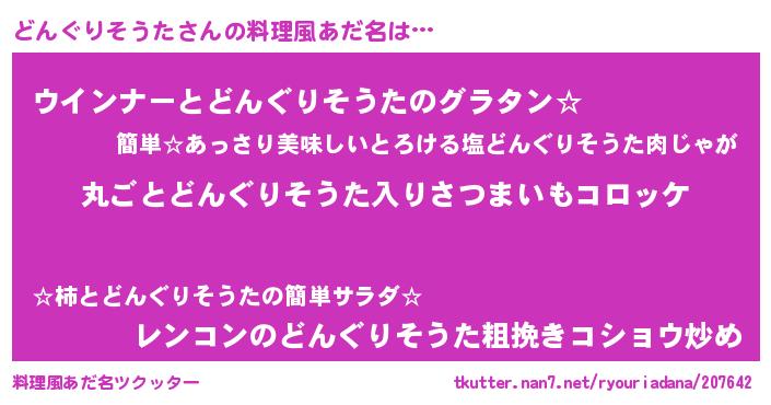 | 意味不明あだ名 | 『住所不定無職どんぐりそうた(86歳)』 |