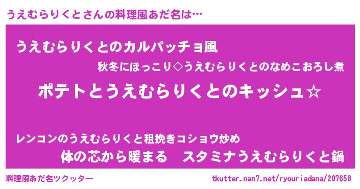 | 女子向けラノベタイトル風あだ名 | 『うえむらりくとの卵を拾いまして』 |