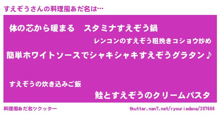 | 男性向けラノベタイトル風あだ名 | 『すえぞうの嫁は女の子じゃないと思った?』 |
