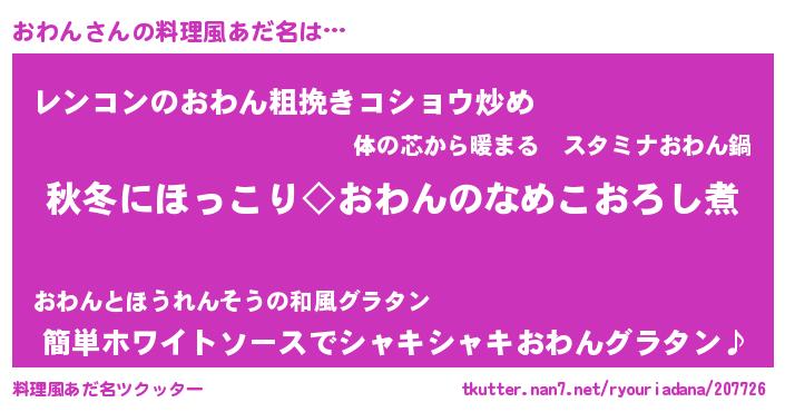 | 男性向けラノベタイトル風あだ名 | 『おわんに滅ぼされるだけの簡単なお仕事です』 |