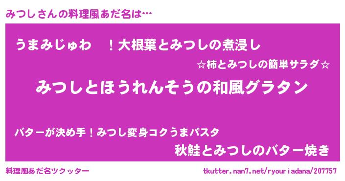 | 女子向けラノベタイトル風あだ名 | 『みつしの玉の輿計画!』『みつし恋絵巻』 |