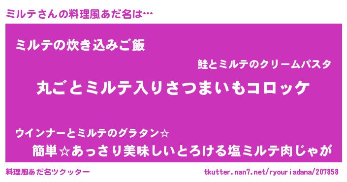 | 男性向けラノベタイトル風あだ名 | 『この素晴らしい世界にミルテを!』 |