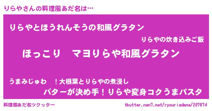 | 男性向けラノベタイトル風あだ名 | 『この素晴らしい世界にりらやを!』 |
