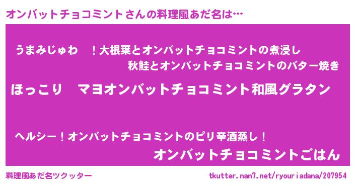 | 胡散臭い通販商品みたいなあだ名 | 『あなたにだけ特別に提供する100年もののヴィンテージワイン…その名も「オンバットチョコミント」』 |