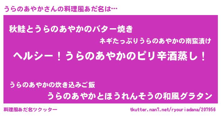 | 男性向けラノベタイトル風あだ名 | 『Re:うらのあやかから始める異世界生活』 |
