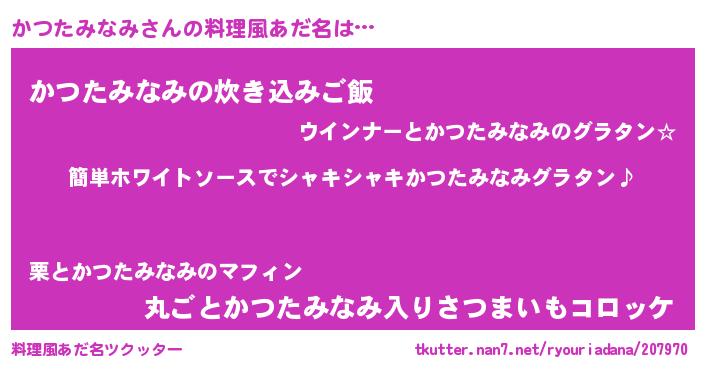 | 男性向けラノベタイトル風あだ名 | 『かつたみなみの嫁は女の子じゃないと思った?』 |