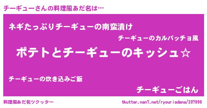 | 男性向けラノベタイトル風あだ名 | 『チーギューの嫁は女の子じゃないと思った?』 |