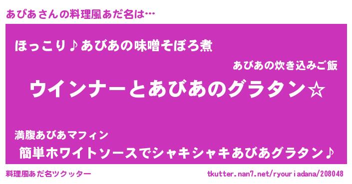| ヘコむあだ名 | 『なまこ酢』『あびふぇ~』『あびを』 |