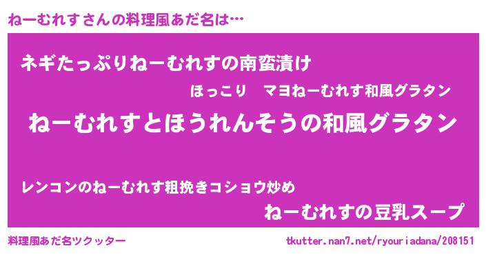 | 女子向けラノベタイトル風あだ名 | 『ねーむれすの玉の輿計画!』 |
