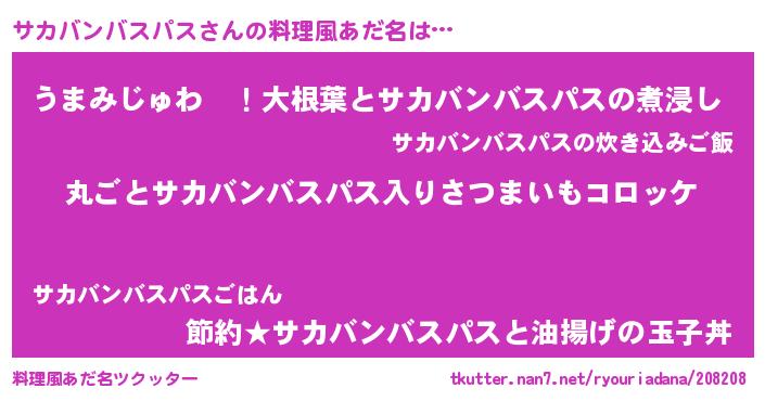 | 女子向けラノベタイトル風あだ名 | 『乙女ゲームの破滅フラグしかない悪役サカバンバスパスに転生してしまった…』 |