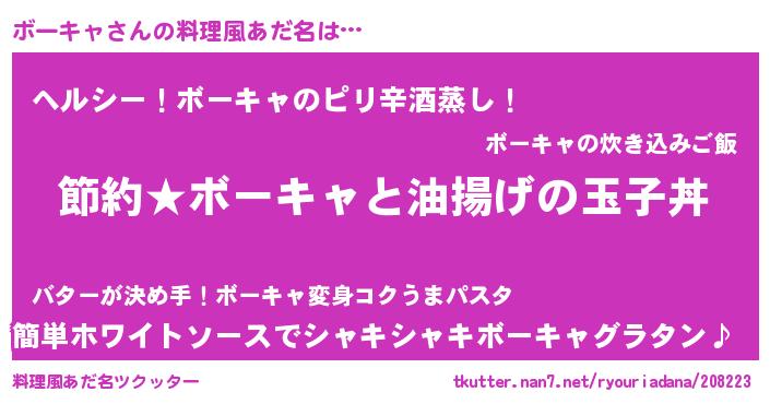 | 女子向けラノベタイトル風あだ名 | 『ボーキャ姫と円卓の騎士』 |