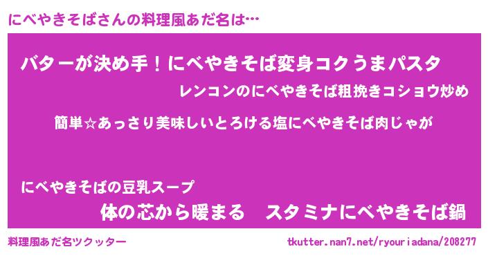 | 胡散臭い通販商品みたいなあだ名 | 『前代未聞の健康食品…その名も「にべやきそば」』 |