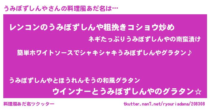 | 男性向けラノベタイトル風あだ名 | 『うみぼずしんやの嫁は女の子じゃないと思った?』 |