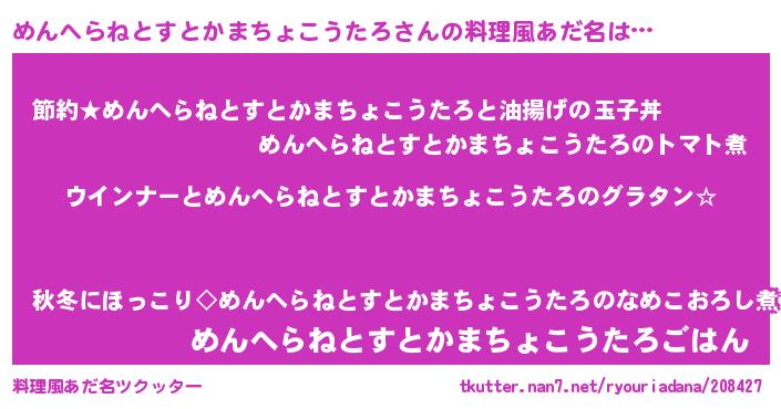 | 欧米人風あだ名 | 『めんへらねとすとかまちょこうたろクリステル』 |