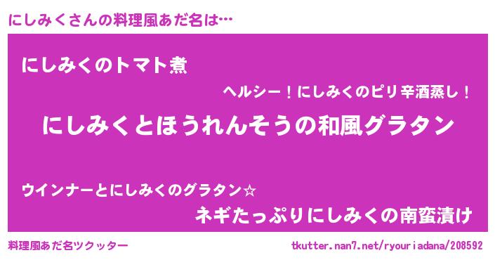 | 意味不明あだ名 | 『もやし科にしみく属』『自称にしみく』 |