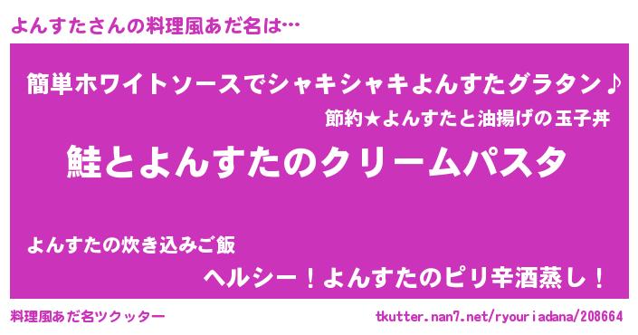 | 女子向けラノベタイトル風あだ名 | 『死神よんすたの再婚』『闇のよんすた』 |