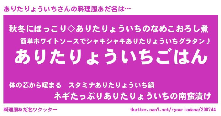 | 男性向けラノベタイトル風あだ名 | 『アリタリョウイチスレイヤー』 |
