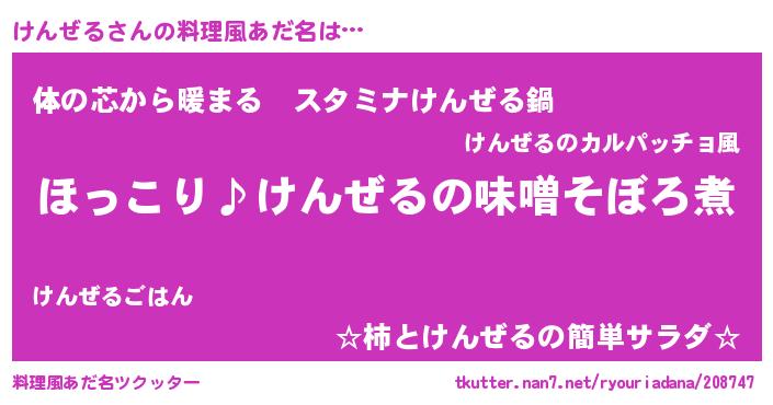 | 男性向けラノベタイトル風あだ名 | 『けんぜるの憂鬱』『魔弾の王とけんぜる』 |