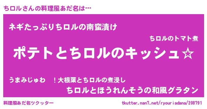 | 女子向けラノベタイトル風あだ名 | 『ちロルの卵を拾いまして』 |