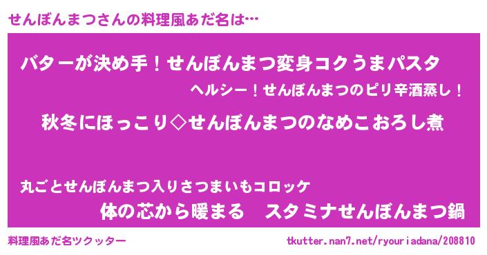 | 男性向けラノベタイトル風あだ名 | 『せんぼんまつに滅ぼされるだけの簡単なお仕事です』 |