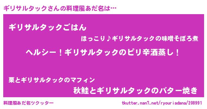 | 男性向けラノベタイトル風あだ名 | 『Re:ギリサルタックから始める異世界生活』 |