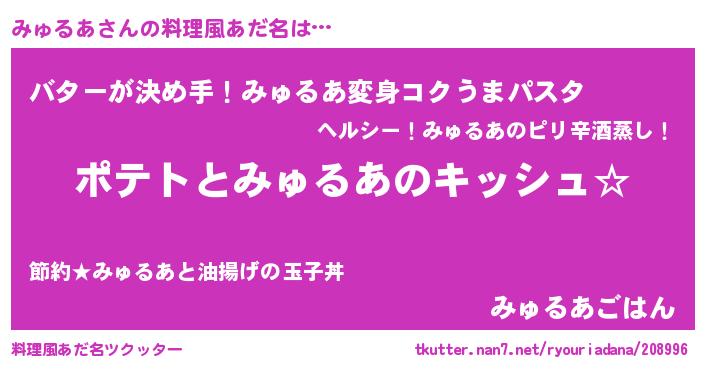 | 女子向けラノベタイトル風あだ名 | 『みゅるあの卵を拾いまして』 |