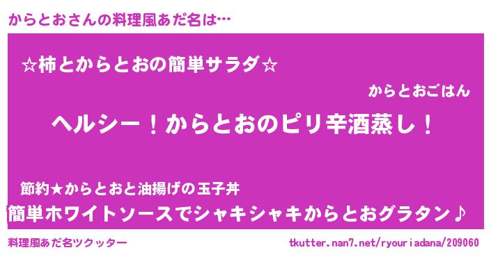 | 意味不明あだ名 | 『自称からとお』『ヨモギ科からとお属』 |