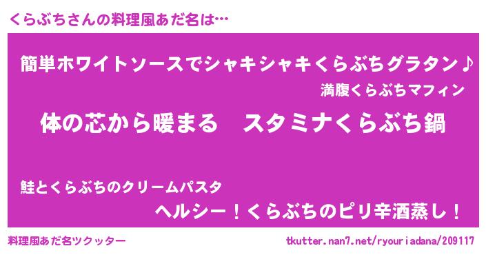 | 女子向けラノベタイトル風あだ名 | 『くらぶちの雑貨屋さん』『闇のくらぶち』 |