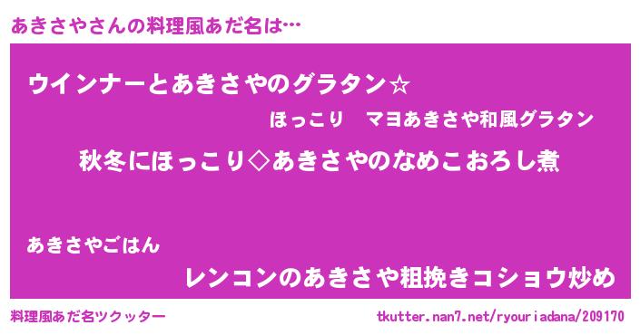 | ヘコむあだ名 | 『酢こんぶ』『あきっ子』『あきにー』 |