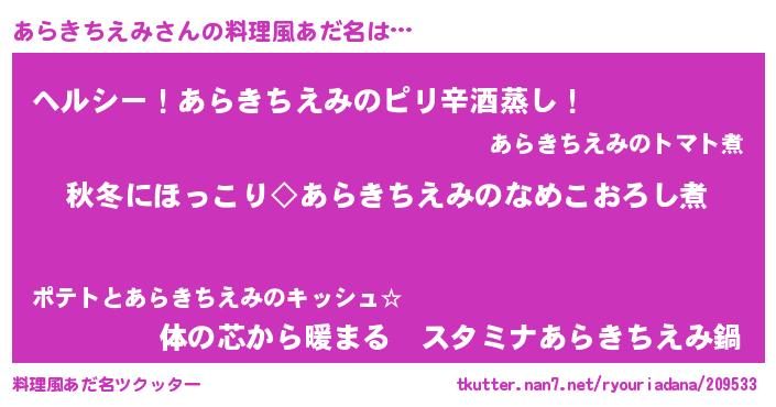 | 男性向けラノベタイトル風あだ名 | 『あらきちえみに滅ぼされるだけの簡単なお仕事です』 |