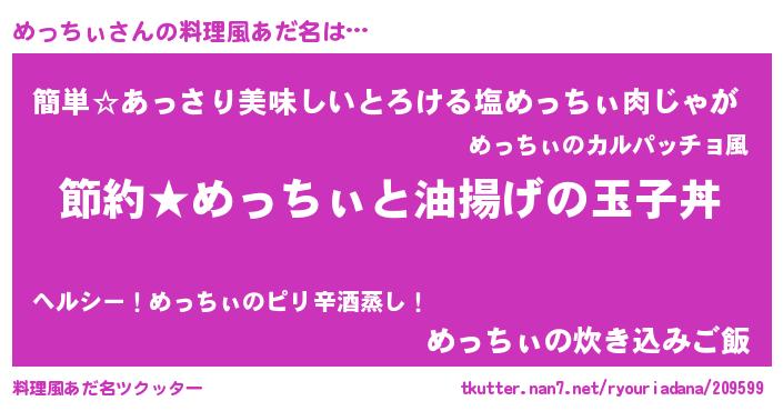 | 胡散臭い通販商品みたいなあだ名 | 『モテモテ間違いなし霊験あらたかなお札…その名も「めっちぃ」』 |