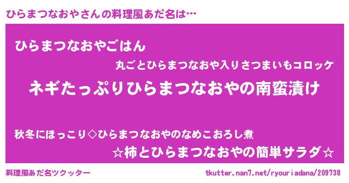 | 男性向けラノベタイトル風あだ名 | 『ヒラマツナオヤアートオンライン』 |
