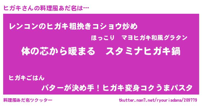 | 女子向けラノベタイトル風あだ名 | 『ヒガキの雑貨屋さん』『ヒガキ恋絵巻』 |