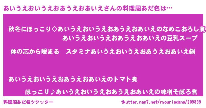 | 女子向けラノベタイトル風あだ名 | 『あいうえおいうえおあうえおあいえの雑貨屋さん』 |
