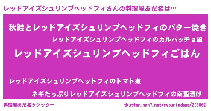 | 男性向けラノベタイトル風あだ名 | 『レッドアイズシュリンプヘッドフィスレイヤー』 |