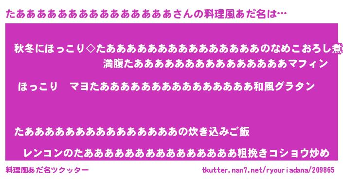 | 男性向けラノベタイトル風あだ名 | 『この素晴らしい世界にたあああああああああああああああを!』 |