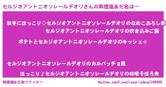 | 女子向けラノベタイトル風あだ名 | 『セルジオアントニオソレールデオリの卵を拾いまして』 |