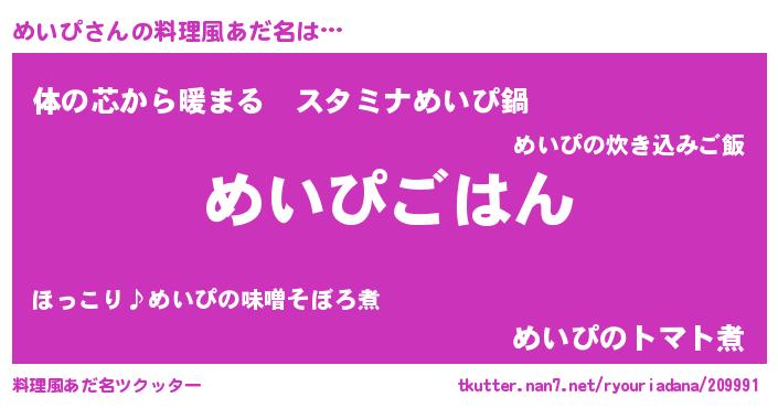 | ヘコむあだ名 | 『豆乳』『めいにゅー』『めいぴ(爆)』 |