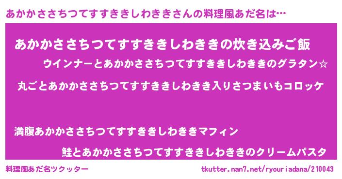 | 男性向けラノベタイトル風あだ名 | 『この素晴らしい世界にあかかささちつてすすききしわききを!』 |