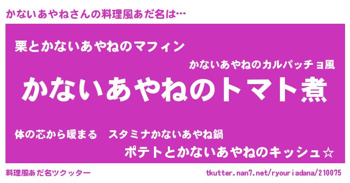 | 女子向けラノベタイトル風あだ名 | 『かないあやね夫妻のなれそめ』 |