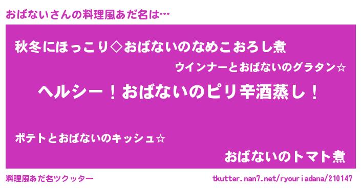 | 男性向けラノベタイトル風あだ名 | 『Re:おばないから始める異世界生活』 |
