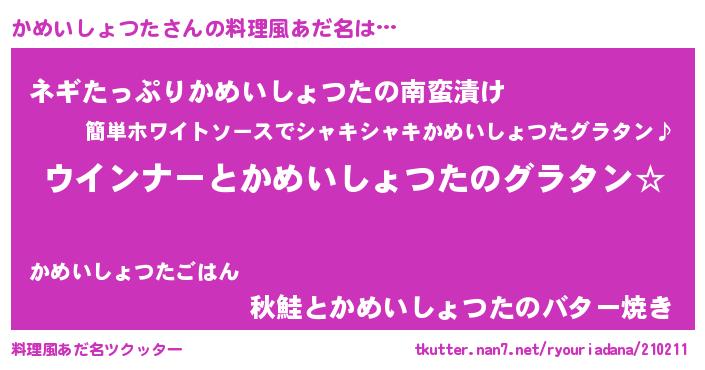 | 意味不明あだ名 | 『かめいしょつたフォーエバー』 |