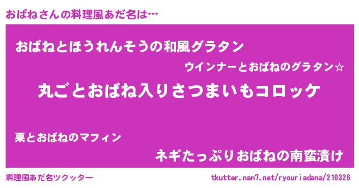 | 男性向けラノベタイトル風あだ名 | 『この素晴らしい世界におばねを!』 |