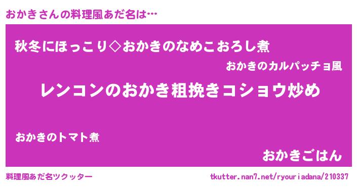 | 意味不明あだ名 | 『自称おかき』『なめこ科おかき属』 |