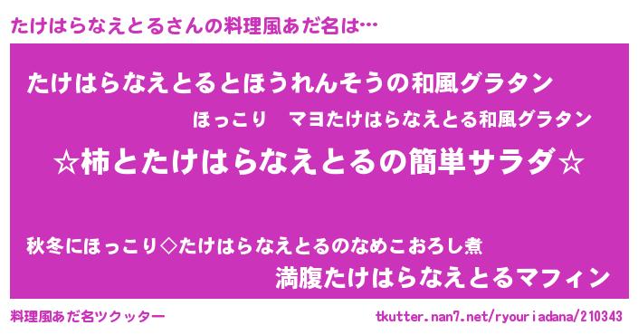 | ヘコむあだ名 | 『たけはらなえとる(小並感)』『たけにゅー』 |