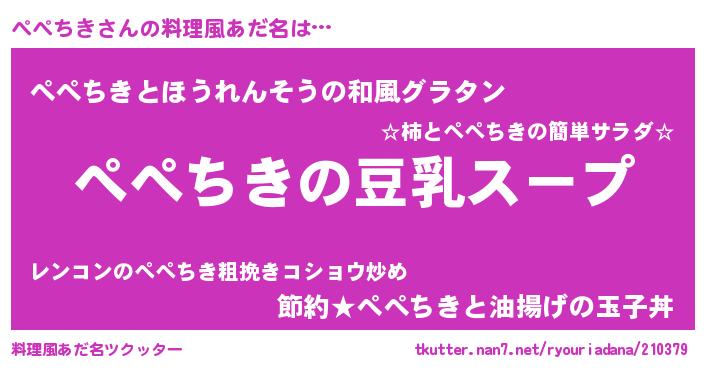 | 男性向けラノベタイトル風あだ名 | 『ダンジョンにぺぺちきを求めるのは間違っているだろうか』 |